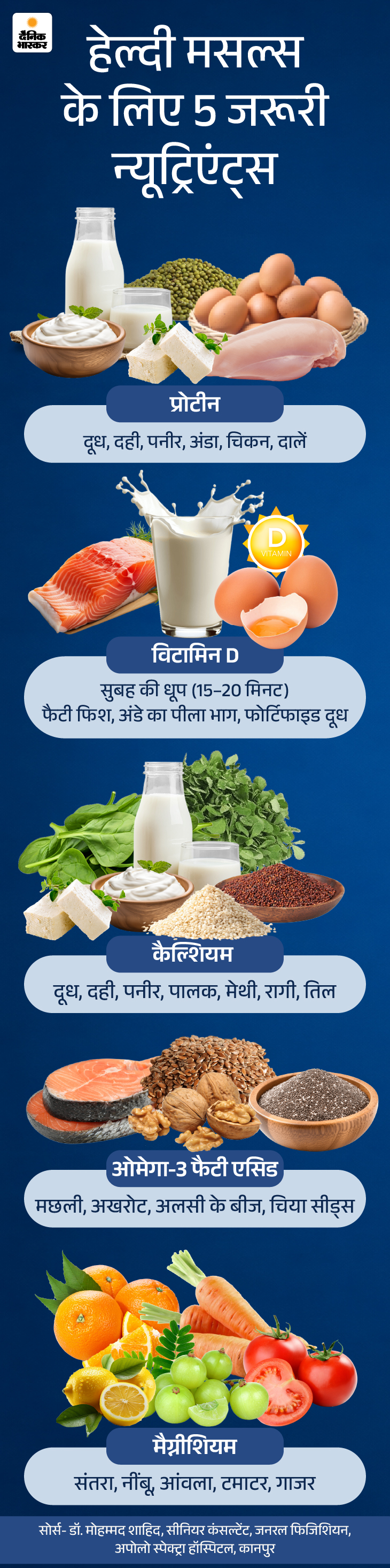 ‘जर्नल ऑफ फूड बायोकेमेस्ट्री’ के मुताबिक, बैलेंस्ड डाइट मांसपेशियों को हेल्दी बनाए रखने में मदद करती है। जरूरी न्यूट्रिएंट्स उनकी कार्यक्षमता सुधारने में भी अहम भूमिका निभाते हैं। ग्राफिक में देखिए कि हेल्दी मसल्स के लिए क्या खाना चाहिए-