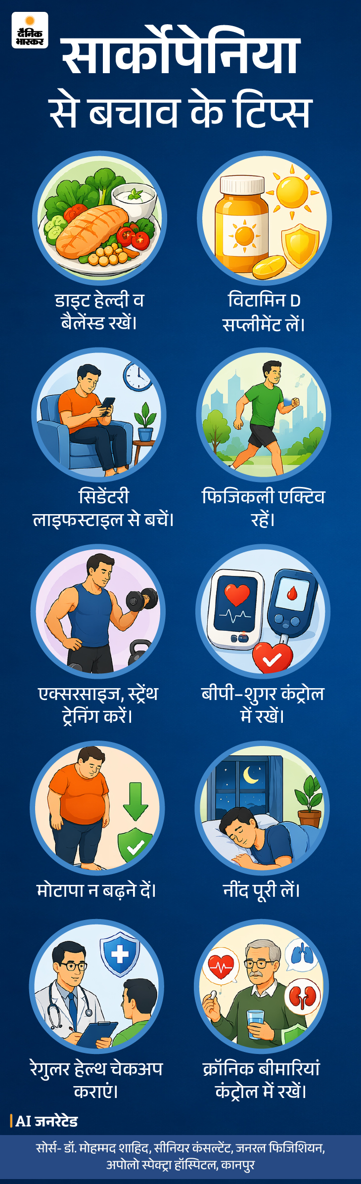 जवाब- सार्कोपेनिया से बचाव के लिए नियमित एक्सरसाइज और हेल्दी डाइट का कॉम्बिनेशन फायदेमंद माना जाता है। ग्राफिक में देखिए सार्कोपेनिया से बचाव के टिप्स-