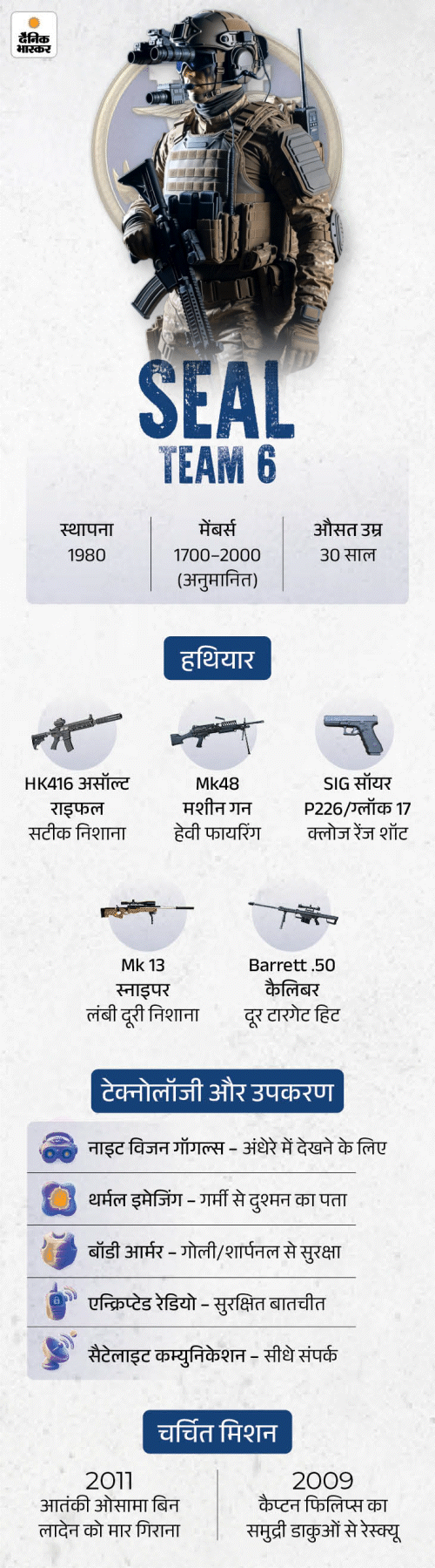 सील टीम 6 को इस तरह तैयार किया जाता है कि वे जमीन, समुद्र और हवा तीनों जगह ऑपरेशन कर सकें। रात, खराब मौसम, दुश्मन के इलाके हर हालत में काम करें और बिना पहचान के सीक्रेट मिशन पूरा करें।