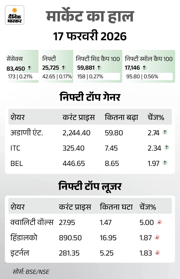 शेयर बाजार में आज यानी 17 फरवरी को बढ़त रही। सेंसेक्स 173 अंक चढ़कर 83,450 पर बंद हुआ है। वहीं निफ्टी में करीब 42 अंक की तेजी रही, ये 25,725 पर बंद हुआ है। आज बैंकिग और IT शेयर्स में तेजी रही। वहीं मेटल और एनर्जी शेयर्स में गिरावट रही।