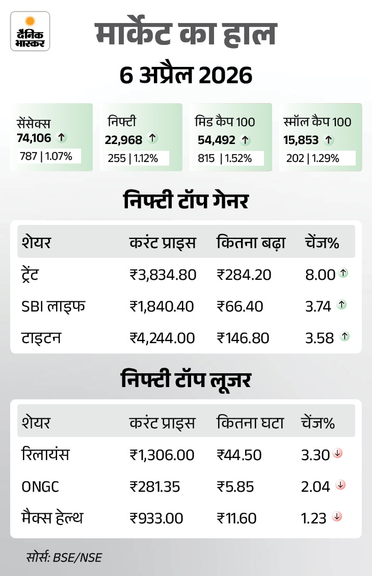 इससे पहले कल यानी 7 अप्रैल को शेयर बाजार में तेजी रही थी। सेंसेक्स 787 अंक (1.07%) चढ़कर 74,106 पर बंद हुआ था। वहीं, निफ्टी में भी 255 अंकों (1.12%) की तेजी रही, ये 22968 के स्तर पर बंद हुआ था।