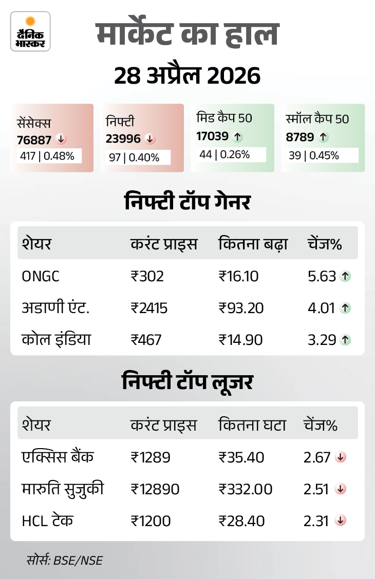 इससे पहले कल यानी 28 अप्रैल को सेंसेक्स 417 अंक (0.54%) की गिरावट के साथ 76,887 पर बंद हुआ था। निफ्टी में भी 97 अंकों (0.40%) की गिरावट रही, ये 23,996 पर बंद हुआ था।