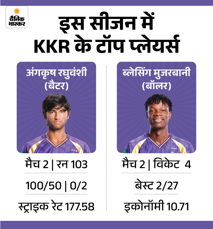 कोलकाता के लिए इस सीजन में कुछ खिलाड़ियों ने शानदार प्रदर्शन किया है। अंगकृष रघुवंशी ने अब तक 2 मैचों में 103 रन बनाए हैं। उनका स्ट्राइक रेट 177.58 का रहा है और उन्होंने 2 अर्धशतक भी लगाए हैं, जो उनकी शानदार फॉर्म को दिखाता है। वहीं गेंदबाजी में ब्लेसिंग मुजरबानी ने 2 मैचों में 4 विकेट हासिल किए हैं। उनका सर्वश्रेष्ठ प्रदर्शन 2/27 रहा है, हालांकि उनकी इकॉनमी 10.71 की है।