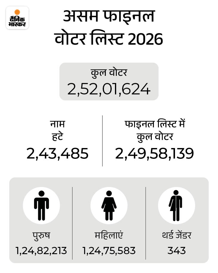 EC ने असम में हुए स्पेशल रिवीजन (SR) 2026 के तहत फाइनल वोटर लिस्ट जारी की थी। EC के मुताबिक, ड्राफ्ट वोटर लिस्ट की तुलना में 2.43 लाख से ज्यादा नाम हटाए गए हैं। अब राज्य में कुल 2,49,58,139 वोटर्स रजिस्टर्ड हैं।