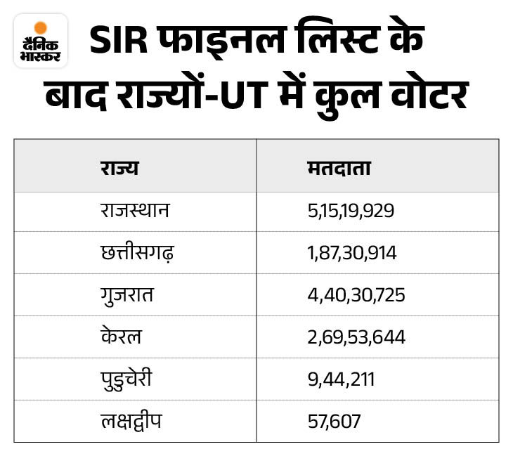 देश के 12 राज्यों-केंद्र शासित प्रदेश में चुनाव आयोग के वोटर लिस्ट के स्पेशल इंटेंसिव रिवीजन (SIR) का दूसरा फेज अपने अंतिम चरण में है। शनिवार को राजस्थान, छत्तीसगढ़ और केरल की फाइनल वोटर लिस्ट पब्लिश हुई। इसके बाद राजस्थान में कुल 5.15 करोड़, छत्तीसगढ़ में 1.87 करोड़ और केरल में 2.69 करोड़ वोटर दर्ज हैं।