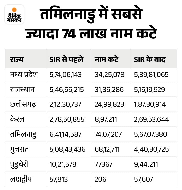चुनाव आयोग (ECI) ने सोमवार को स्पेशल इंटेंसिव रिविजन (SIR) 2026 के तहत तमिलनाडु की फाइनल वोटर लिस्ट पब्लिश कर दी है। इसके मुताबिक राज्य में अब कुल 5.67 करोड़ वोटर के नाम हैं। इस प्रोसेस में करीब 74 लाख लोगों के नाम काटे गए हैं।
