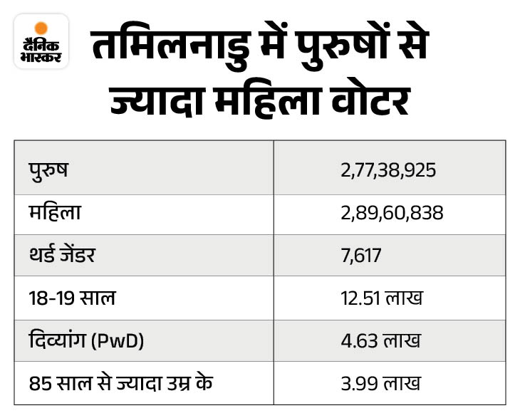 सबसे ज्यादा 5,36,991 वोटर चेंगलपट्टू जिले की विधानसभा नंंबर 27 शोझांगनल्लूर में हैं। वहीं सबसे कम 1,16,896 वोटर चेन्नई जिले की विधानसभा नंबर 18 हार्बर में दर्ज हुए हैं।