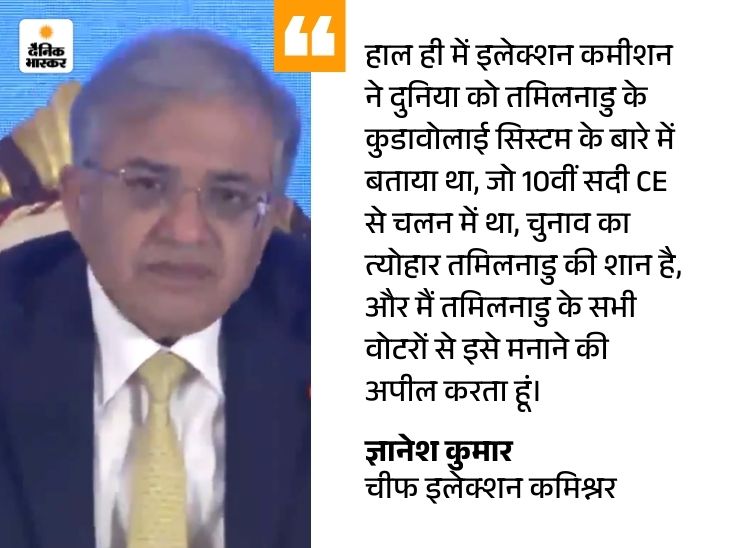चीफ इलेक्शन कमिश्नर(CEC) ज्ञानेश कुमार ने चुनावी प्रक्रिया को तमिलनाडु की शान बताया। उन्होंने शुक्रवार को चेन्नई में तमिलनाडु विधानसभा चुनाव की तैयारियों को लेकर प्रेस कॉन्फ्रेंस की।