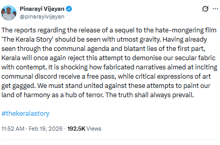 वहीं, गुरुवार को केरल के मुख्यमंत्री पिनराई विजयन ने ‘द केरल स्टोरी’ के सीक्वल का कड़ा विरोध करते हुए इसे राज्य में सांप्रदायिक वैमनस्य भड़काने की एक और कोशिश बताया।
