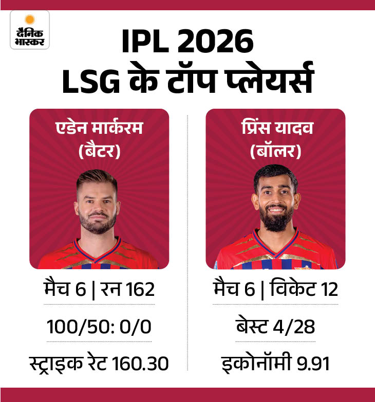 लखनऊ के लिए इस सीजन में ऐडन मार्करम शानदार फॉर्म में नजर आए हैं। उन्होंने 6 मैचों में 162 रन बनाए हैं और 160.30 के स्ट्राइक रेट से बल्लेबाजी करते हुए टीम के मिडिल ऑर्डर को मजबूती दी है, हालांकि अब तक उनके बल्ले से कोई फिफ्टी या सेंचुरी नहीं आई है।