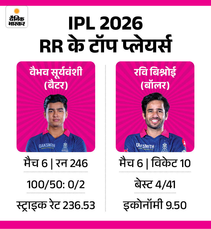 राजस्थान के लिए वैभव सूर्यवंशी ने 6 मैचों में 246 रन बनाए हैं और 236.53 के शानदार स्ट्राइक रेट से बल्लेबाजी करते हुए विरोधी गेंदबाजों पर लगातार दबाव बनाया है। उनके नाम इस सीजन में 2 अर्धशतक भी हैं।