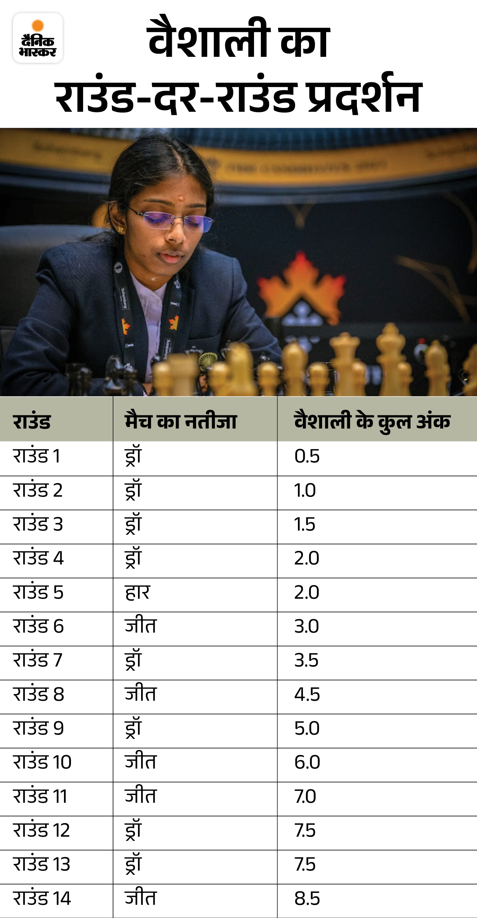 वैशाली ने फाइनल राउंड में सफेद मोहरों से खेलते हुए रूस की अनुभवी खिलाड़ी कैटरिना लग्नो को हराया।