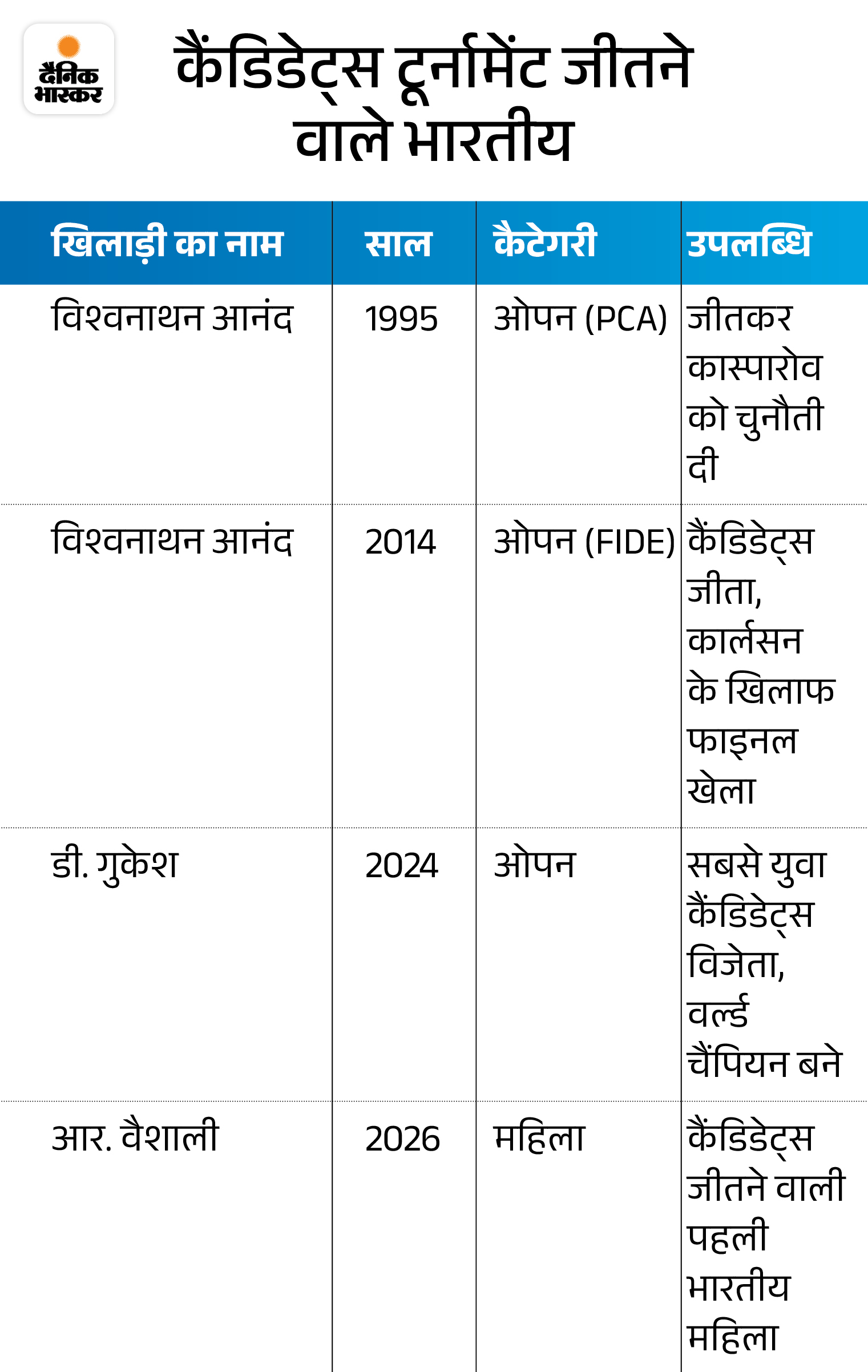पिछली बार भारत के डी गुकेश ने इसे जीतकर चीन के डिंग लिरेन को चुनौती दी थी। तब गुकेश कैंडिडेट्स टूर्नामेंट जीतने वाले भारत के दूसरे खिलाड़ी बने थे। 5 बार के वर्ल्ड चैंपियन विश्वनाथन आनंद ने 1995 में पहली बार कैंडिडेट्स टूर्नामेंट जीता था।