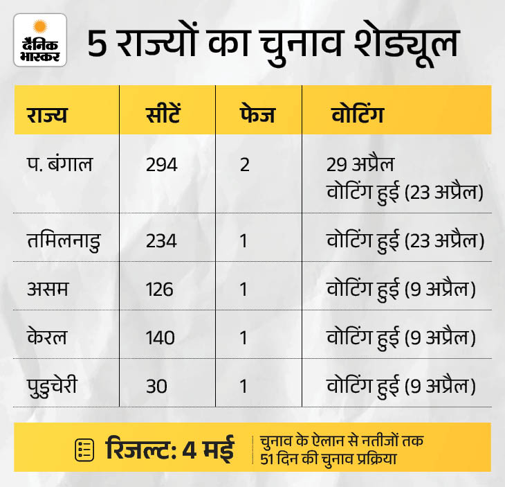 तमिलनाडु में मतदान एक ही चरण में पूरा हुआ, जबकि पश्चिम बंगाल में चुनाव दो चरणों में हो रहा है। दूसरा चरण 29 अप्रैल को होगा।