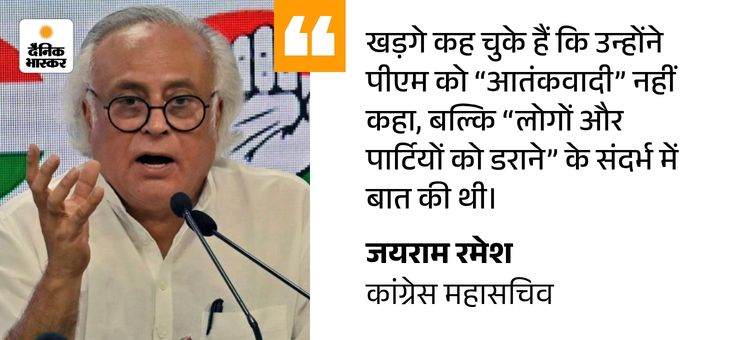 कांग्रेस अध्यक्ष मल्लिकार्जुन खड़गे ने चेन्नई में मंगलवार को कहा था ‘मोदी एक आतंकवादी की तरह हैं जो समानता में विश्वास नहीं रखते। उनकी पार्टी भी समानता और न्याय में विश्वास नहीं रखती।’ उन्होंने कहा था कि पीएम मोदी लोगों और राजनीतिक पार्टियों को डरा रहे हैं। मैंने कभी नहीं कहा कि वह आतंकवादी हैं। मेरा मतलब है कि मोदी हमेशा धमकी देते हैं।