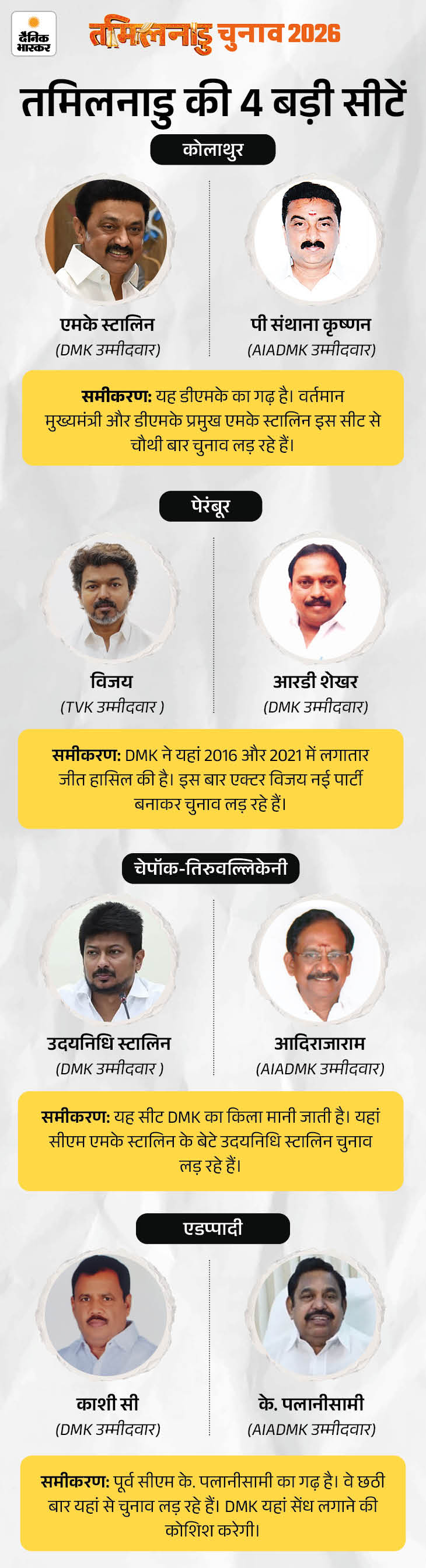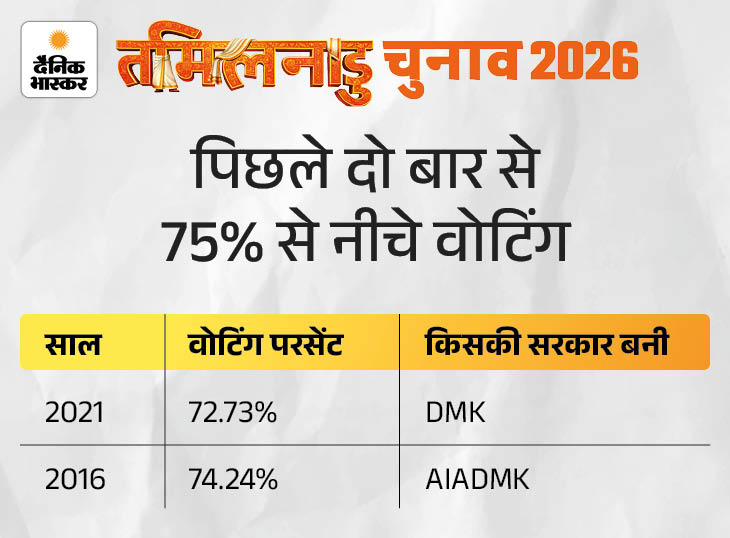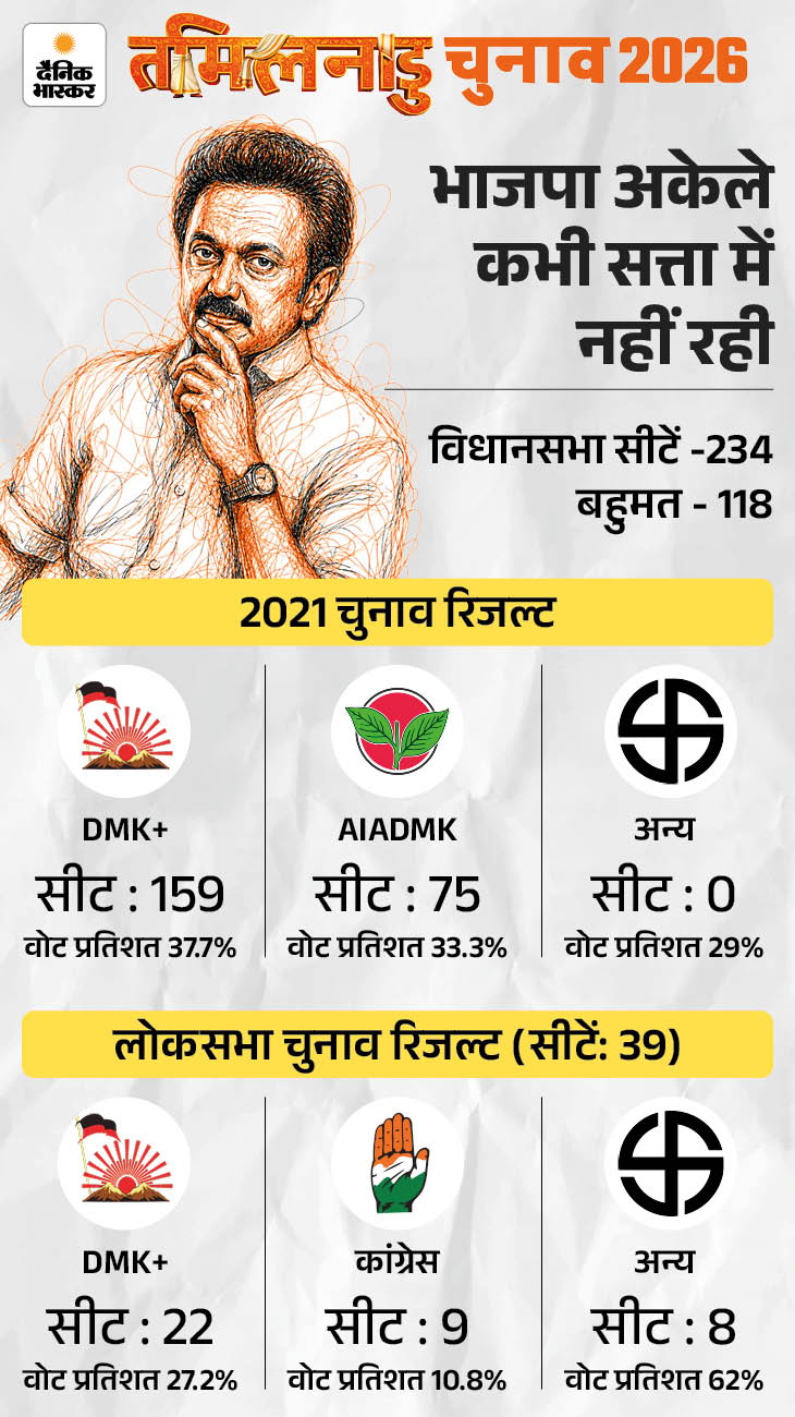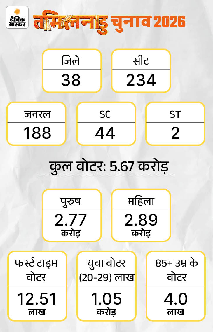 तमिलनाडु में DMK+ कांग्रेस और AIADMK+ BJP के बीच मुकाबला है। तमिल एक्टर थलापति विजय की नई पार्टी TVK इस लड़ाई को त्रिकोणीय बना रही है।