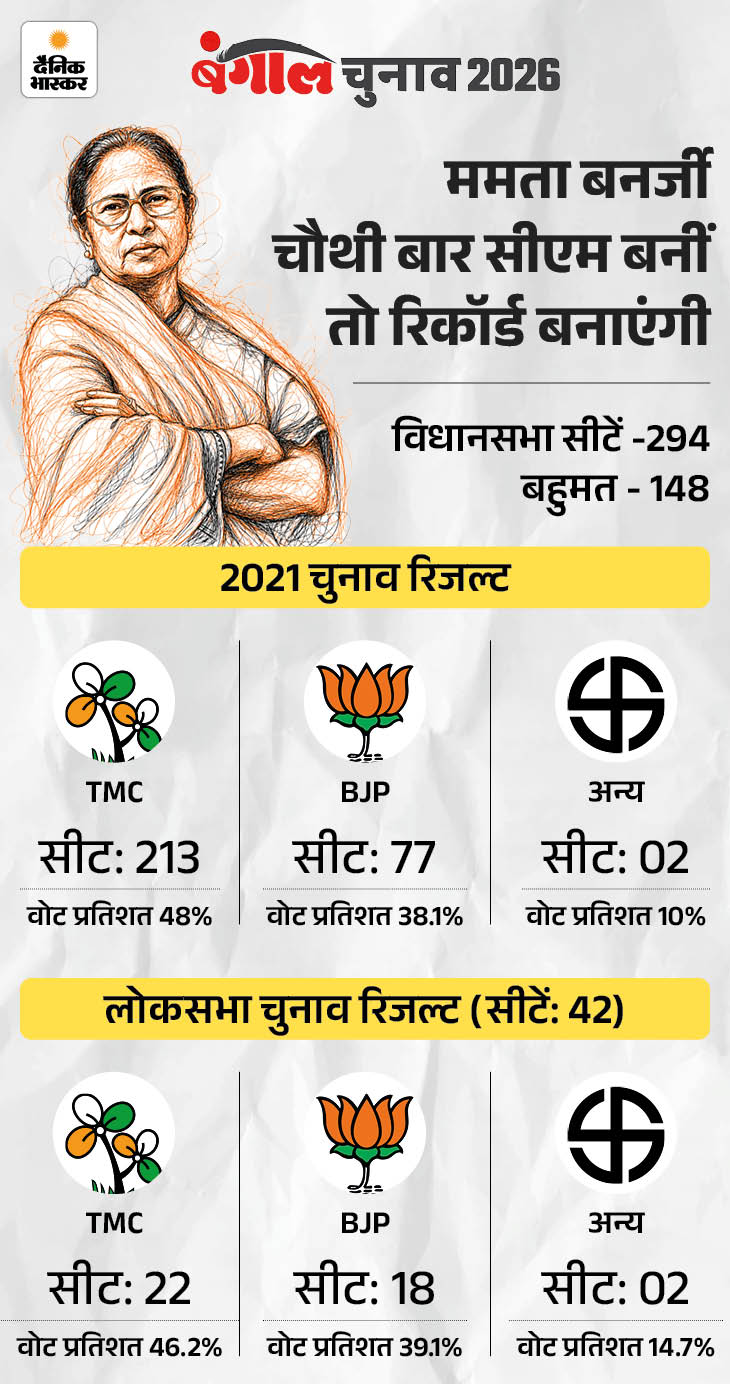 बंगाल में 14 साल से CM ममता के सामने BJP मुख्य चुनौती है। 2026 के चुनाव में टीएमसी जीती तो ममता बनर्जी लगातार चौथी बार मुख्यमंत्री बनेंगी। वे ऐसा करने वाली देश पहली महिला होंगी। जयललिता के नाम 5 बार तमिलनाडु की मुख्यमंत्री बनने का रिकॉर्ड है। हालांकि, वह 1991 से 2016 तक अलग-अलग कार्यकाल (लगातार नहीं) में मुख्यमंत्री पद पर रहीं।