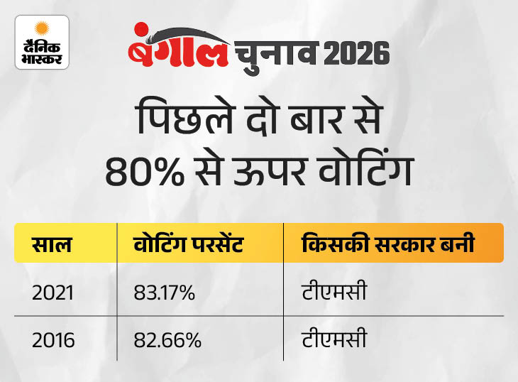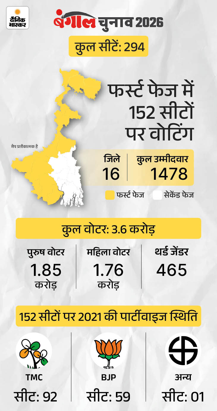 पश्चिम बंगाल में कुल 294 सीटे हैं। जिसमें 210 जनरल सीटें हैं। वहीं 68 सीटें एससी और 10 सीटें एसटी के लिए आरक्षित हैं। राज्य में कुल 6.8 करोड़ वोटर्स हैं। पांच लाख से ज्यादा लोग पहली बार वोट डालेंगे। वहीं 3.79 लाख वोटर्स 85 से ज्यादा उम्र के हैं। फर्स्ट फेज में 16 जिलों की 152 सीटों पर वोटिंग होगी। 44,376 पोलिंग बूथ बनाए गए हैं।