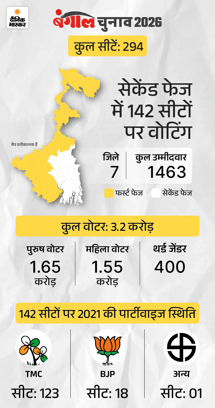 बंगाल में TMC और BJP के बीच मुख्य मुकाबला है। यहां के सभी बूथों पर वेबकास्टिंग (लाइव मॉनीटरिंग) होगी। राज्य की बाकी 142 सीटों पर दूसरे फेज में 29 अप्रैल को वोटिंग होगी। रिजल्ट 4 मई को आएंगे।