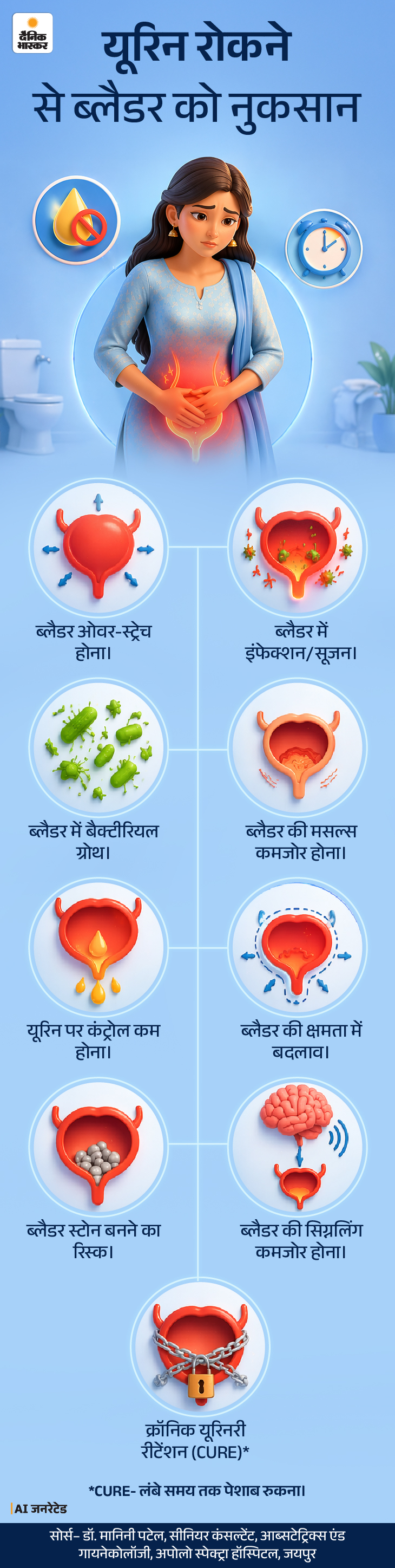 जवाब- ब्लैडर ज्यादा देर तक भरा रहने से उसकी मांसपेशियों और अंदरूनी लेयर पर लगातार दबाव पड़ता है। इससे संक्रमण व अन्य कॉम्प्लिकेशन का जोखिम बढ़ता है। ग्राफिक से समझिए यूरिन रोकने से ब्लैडर को क्या नुकसान होता है-