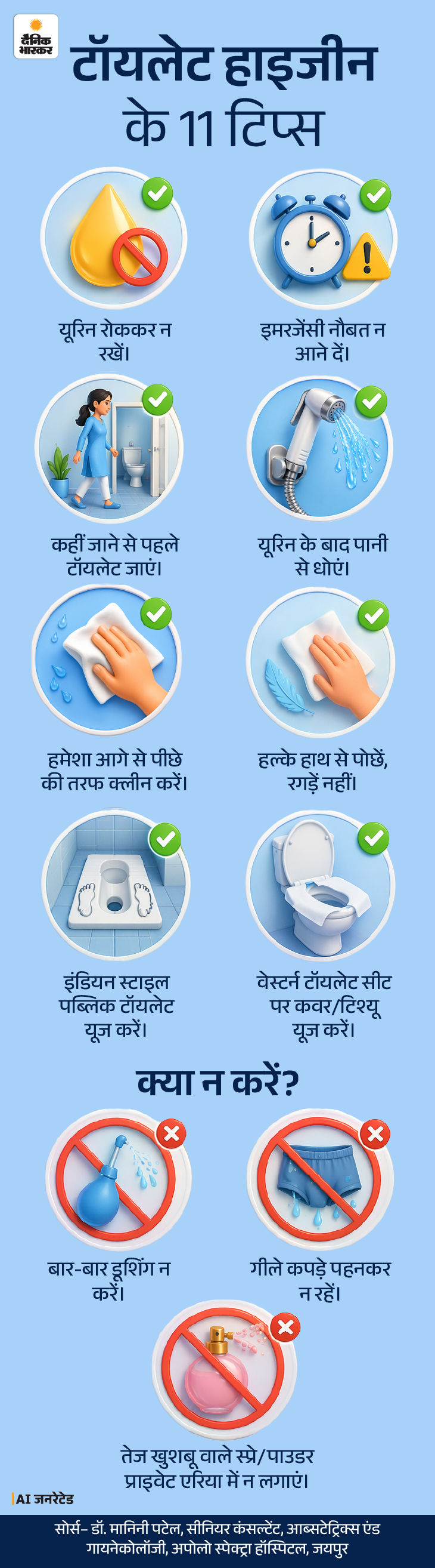लंबे समय तक यूरिन रोकने से ब्लैडर पर अतिरिक्त दबाव पड़ता है, उसकी कार्यक्षमता प्रभावित होती है और यूरिनरी ट्रैक्ट इंफेक्शन (UTI) का खतरा बढ़ जाता है। इससे मसल्स कमजोर होने और किडनी से जुड़ी समस्याएं भी हो सकती हैं। ऐसे में महिलाओं के लिए सही टॉयलेट हाइजीन अपनाना जरूरी है।