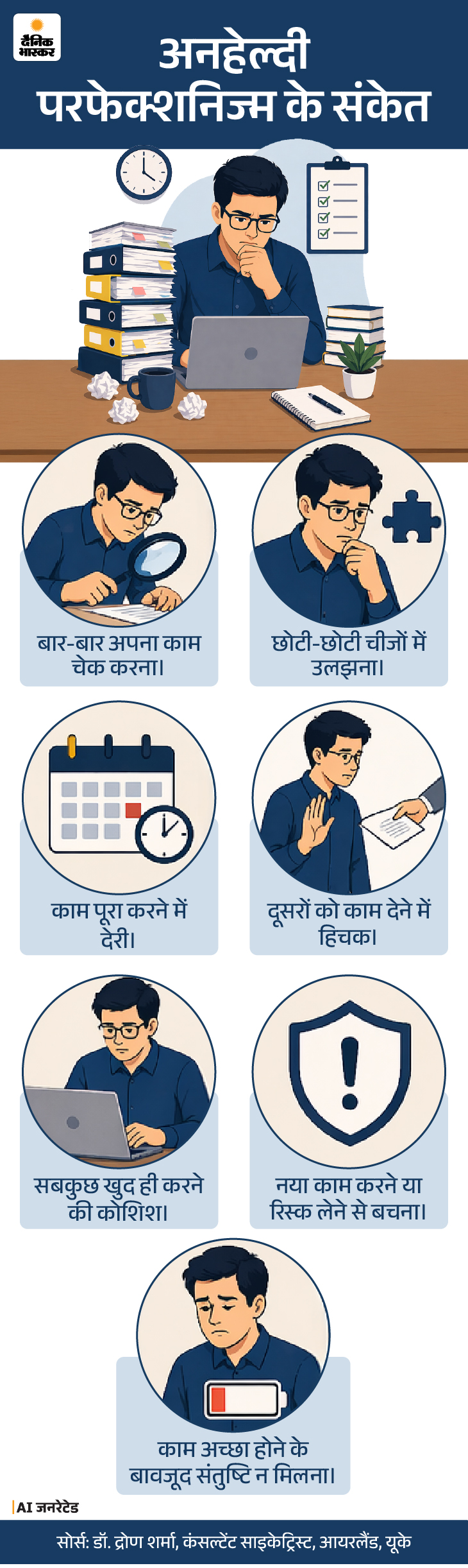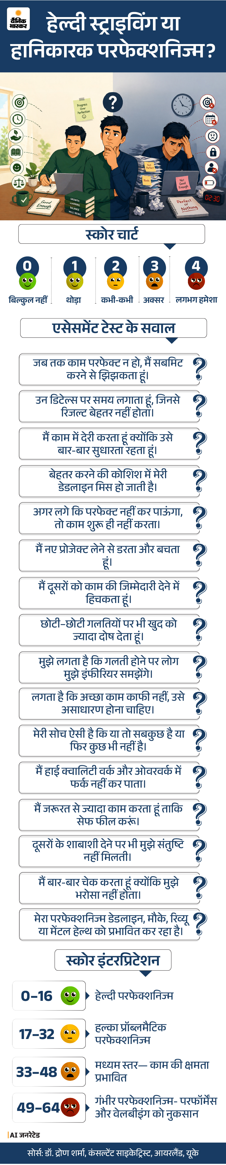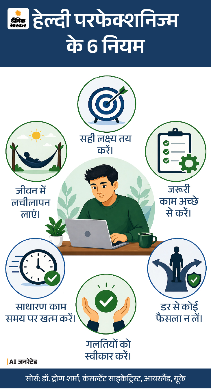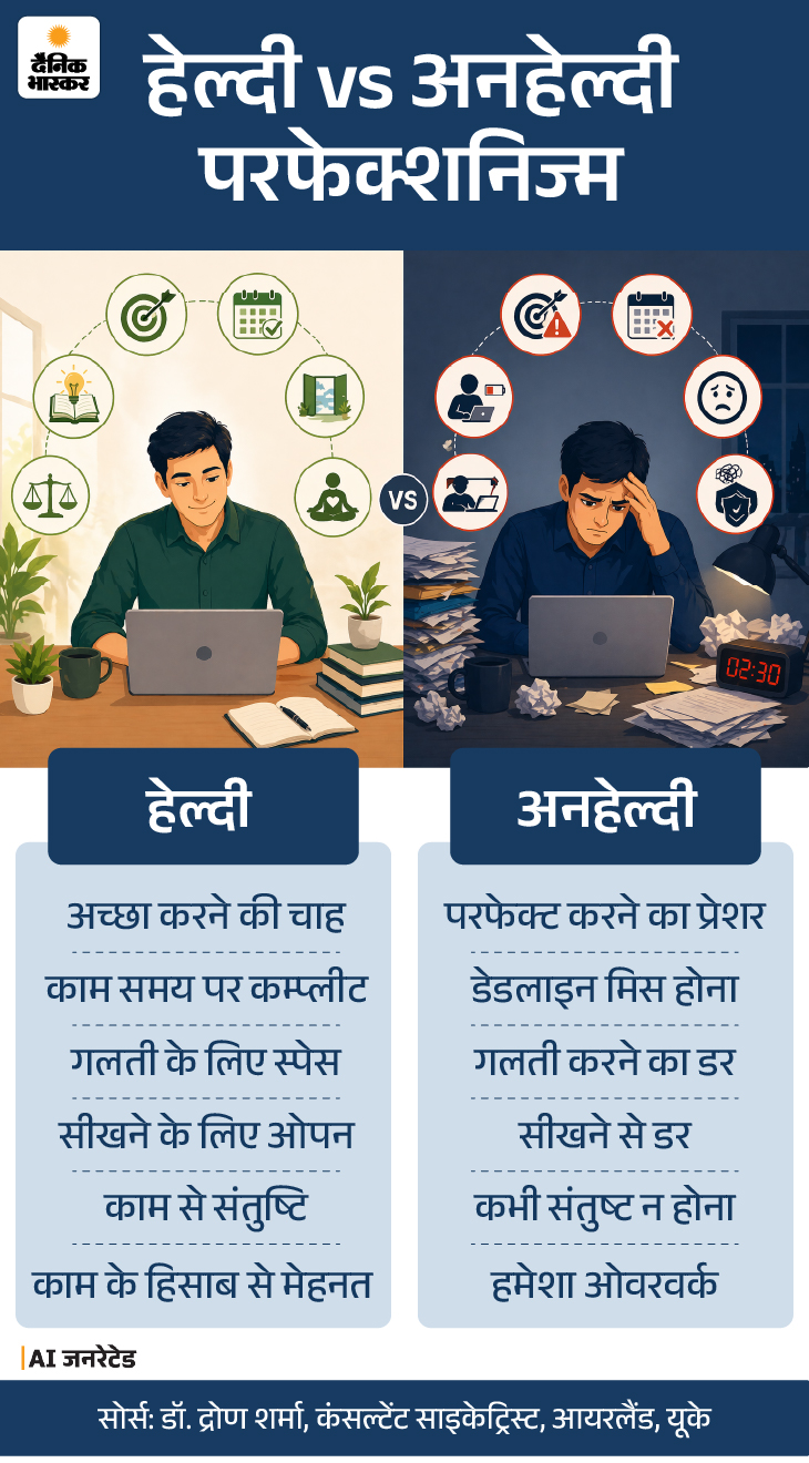 बाहर से देखकर लगता है कि यह “बहुत मेहनत” का काम है, लेकिन अगर भीतर उतरकर देखें तो यहां एंग्जाइटी और सेल्फ डाउट का एक खेल चल रहा होता होता है। नीचे ग्राफिक में हेल्दी और अनहेल्दी परफेक्शनिज्म का फर्क देखें।